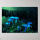 Original illustration of fairy-like blue mushrooms growing in a mystical glen with sparkling pixie dust. Moss drapes off a branch in a dark green forest.
