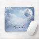 A mouse pad with a magical fantasy sky with fluffy blue clouds and a big beautiful moon. 2 white swans flying off together.