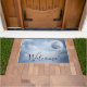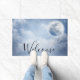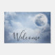 A welcome doormat with a magical fantasy sky with fluffy blue clouds and a big beautiful moon. 2 white swans flying off together.