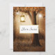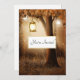 A wedding invitation with a whimsical enchanting illustration in rich brown and yellow colours. A magical mystical forest with a large tree holding an old fashioned lantern. Fairy lights dancing all around. Magical mystical design.