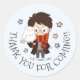Express your gratitude with a magical touch using this adorable round Harry Potter themed favour sticker. It features a charming chibi illustration of Harry Potter in his Gryffindor scarf, holding his loyal snowy owl, Hedwig, surrounded by whimsical coloured stars. The sticker is designed with a "THANK YOU FOR COMING!" message arched around the central image, making it perfect for sealing party favour bags, decorating envelopes, or adding a special detail to thank-you notes. It's an enchanting way to show appreciation to your guests at any wizard-themed celebration or event.