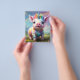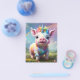 In the heart of a vibrant meadow with wildflowers, a colorful baby pig unicorn frolics joyfully under the arch of a radiant rainbow stretching across the sky. The piglet's soft, chubby body is adorned in pastel pinks and purples, with shimmering patches of gold and blue that catch the sunlight. Atop its tiny head is a spiraled horn, delicate and glowing with an blue iridescent light, as if it holds the very essence of magic.
