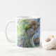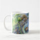 Try saying that 5 times fast! Ceramic mug featuring a "magical meeting" between a dolphin and a unicorn, as depicted by Jo Wall.