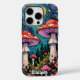 This painting depicts a fantastical forest teeming with oversized mushrooms against a vibrant green and blue background. The artwork is chraacterised by its heavy impasto texture, with thick, swirling brushstrokes that create a dynamic and dreamlike atmosphere. The scene is dominated by two large mushrooms with red caps and white spots, their pink undersides glowing. The background features stylised trees and a prominent orange moon, adding to the surreal and magical feel of the composition.