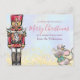 This festive holiday postcard features a Nutcracker Winter Wonderland theme. The background is magical winter sky with a cloudy blue design and twinkly lights in the back. The Nutcracker in the bottom left and a cute little Mouse King in the bottom right.