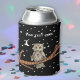 This can or bottle cooler has a magical brown owl with golden eyes sitting on a tree branch wearing a purple crystal necklace under the moon and stars in a black night sky. Customise your text on the front and back with the template.
