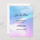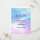Save the date postcard with a soft and lovely background image. Pastel blues and pinks clouds and a magical rainbow.