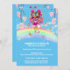 A beautiful melanin magical rainbow girl with big eyes and rainbow hair is clutching a colourful ice cream in her hand and is walking across a rainbow bridge that has pretty pink flowers and butterflies around it all set against a sky blue background. Faux sparkling lights appear behind her and white templates for your personalised wording appear below her. This is ideal for little girls magical fantasy birthday parties; for adorable baby shower events and fairytale theme birthdays.