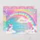 A Magical Rainbow Unicorn Kid Children Birthday Party Invitation. On a multicolor sky background, Happy Birthday is written within a rainbow and surrounded by clouds, stars and cute unicorns. Personalize by adding your full event and contact details.
