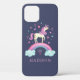 A cute, magical unicorn with hearts and a rainbow decorate this Apple Iphone 12 cell phone case. Personalise it with her name. Makes a fun gift for a girl. Designed for you by Blackberry Boulevard.