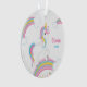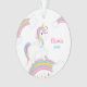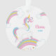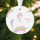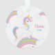 Cute personalised unicorn Christmas ornament. This fun design features a sweet unicorn illustration, stars and a rainbow. Trendy pink, purple, blue and yellow colours with a touch of faux gold glitter.
