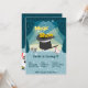 The magical show kids 8th birthday party invitation card shows a light flooded magician stage framed by a blue curtain.