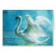 A charming, magical and absolutely wonderful image of a white swan. Flapping and fluttering, showing off its gorgeous wings while enjoying a light summer rain shower. The background and overall tone is a beautiful turquoise blue. Rejuvenating and refreshing. The image has an enchanting fantasy quality to it.