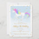 Magical unicorn birthday invitations with gold glitter stars and rainbow colours! Text in gold with a rainbow unicorn against a sky blue background.