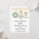 Unicorn First Birthday Party Invitation in a cute whimsical style with faux gold glitter, doughnut, floral letter and unicorn cake. Pink, gold and aqua hues for a magical birthday party celebration. White on the reverse side of the invite. The back of the invite in solid pastel aqua.