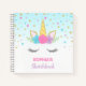 This cute unicorn face name sketchbook for kids can be personalised using the online tools. Design features pink, purple, teal stars and flowers, with a touch of faux glitter.