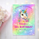 A magical Unicorn birthday invitation featuring a beautiful unicorn against a rainbow background with glittery sparkles. Back of card features glittery sparkles and rainbow background. The perfect unicorn invitation for your little one's birthday, customisable for any age!