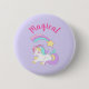A button with an adorable white unicorn with pastel green, purple, yellow and pink curly mane and tail. This magical creature is laying down sleeping peacefully with a rainbow coloured shooting star flying above. Text says "Magical" in a pink trendy font. Pastel purple and white polka dot background.