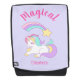 A backpack with an adorable white unicorn with pastel green, purple, yellow and pink curly mane and tail. This magical creature is laying down sleeping peacefully with a rainbow coloured shooting star flying above. Text says "Magical" in a pink trendy font. Pastel purple background.