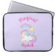 A personalised laptop sleeve with an adorable white unicorn with pastel green, purple, yellow and pink curly mane and tail. This magical creature is laying down sleeping peacefully with a rainbow coloured shooting star flying over her head. Text says "Magical" in a pink trendy font. Pastel purple and white polka dot background.