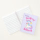 A customised spiral notebook with an adorable white unicorn with pastel green, purple, yellow and pink curly mane and tale. This magical creature is laying down sleeping peacefully with a rainbow coloured shooting star flying over her head. Text says Magical notebook in a pink trendy font. The back cover has a pastel purple background with a white polka dot pattern.