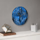 Blue orb wall clock with tree silhouette images.