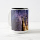 This design features a beautiful image of two tall trees rising up into the sky, surrounded by other trees in a forest. The scene is set at night-time when everything looks particularly magical and enchanting. There is a flock of birds in flight overhead. The sky is made up of a beautiful mixture of purple and blue; it is dotted with bright white stars.