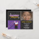 This Magic Show party invitation features a white rabbit peeking out of a magician's top hat, a magic wand, a place for your child's photo and customisable text for your party information.
