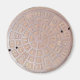 Iron manhole cover used by utility company. Design is concentric circles divided into pie segments, with letters.