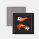 This square magnet is shown with a art print of a flaming soccer ball.