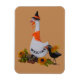 Goose with orange kerchief sits amid fall floral accents, next to blackbird. Black hat on goose has orange ribbons. Yellow and orange sunflowers sit among green leaves.