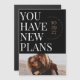 Let your guests know that they now have big plans for your wedding day. This unique Save the Date photo card features a bold white headline on a black background and reads "You have new plans" along with a customisable photo. The wedding date, couple's names, and the wedding location are provided in a stamp-like graphic alongside the bold headline. This magnetic save the date card serves as a great reminder for your guests of their new plans.