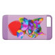 A vibrant phone case featuring a colourful, stylised illustration of a cat with a playful expression. The cat, rendered in a spectrum of bright hues, appears to nestle against a large red heart. The background is a soft lavender enhancing the cat.