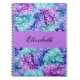This notebook features magnificent hydrangea blossoms combined into a lush, floral pattern. For all flower lovers! Colours in turqouise, lavender, blue. Custom text and colour!