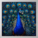 Magnificent peacock, prominently displaying its vibrant plumage. The peacock's body is a deep, rich blue, and it has a long, elegant neck that leads to a gracefully arched head. Its feathers are intricately detailed, with an array of iridescent blue and green hues, accented by striking eye-like patterns in shades of gold and orange. The background is dark, which enhances the brightness and vividness of the peacock's feathers, creating a stunning visual contrast. The overall composition conveys a sense of beauty and elegance, capturing the allure of this iconic bird.