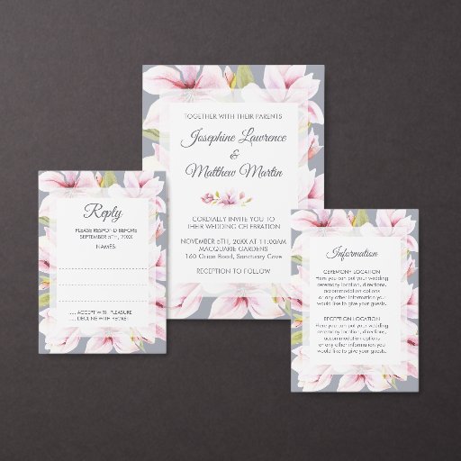 These wedding programs feature beautiful magnolia flowers. The front of the card has the ceremony and the back of the card lists the bridal party. These wedding programs are part of a collection which includes a range of matching wedding stationery such as wedding invitations, reply cards, enclosure cards, address labels, stickers and much more. Please visit the collection pages in our store to see the full range.