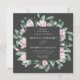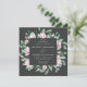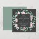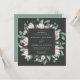 Elegant floral wedding invitations featuring your wedding details surrounded by a geometric frame of watercolor pink magnolia flowers and green eucalyptus leaves against a charcoal background. The reverse side of the square wedding invitations features a solid eucalyptus green background. Designed to coordinate with our Magnolia & Eucalyptus wedding collection.
