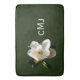 Super soft bath mat with a large creamy white magnolia blossom on a deep green background and monogrammed with your initials in a soft creamy white.