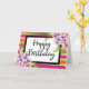 A happy birthday greeting card with an elegant pattern composed of pink, orange and faux gold metallic horizontal stripes. Layered over top is a frame with a black border. Large pink and and purple watercolor magnolia flowers with green leafy accents decorate the design.