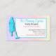 House cleaning business card done in a netting pattern of purple, coral and yellow, with graphics of a aqua coloured maid's silhouette. Personalise the custom text to suit your business needs.