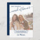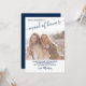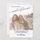 Personalised wedding proposal card for your maid of honour with your own custom photo, elegant handwritten script and a blue and white colour theme. The photo template is set up for you to add your own picture to the front. The wording reads "[bridesmaid name], please be my maid of honour .. [groom name and I are getting married so the next question is, will you be my maid of honour? [sign off and bride name]". All of the wording is editable, except the first instance of "maid of honour" which is hand lettered. The typography and background colours can be changed - please click customise further - or message me for assistance.