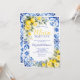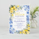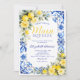 The back of the invitation continues the blue tile and watercolor lemon floral design, creating a cohesive and polished stationery set. Easily personalize with your event details to create a memorable and beautifully styled bridal shower invitation.