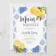Lemon hues and party cues: a tale of love written in a lemonade stand or lemon trees grove with an Italian blue tiles backdrop. This invitation with a "She found her main squeeze" theme captures the essence of this sweet narrative, inviting you to celebrate the bride's discovery of love and a bright and sunny bridal shower theme. Explore a citrus themed bridal shower that radiates warmth and zest. A trendy and modern watercolor illustration of lemons and lemon branches, arranged in an oval frame, provides the backdrop for this elegant and chic citrus themed bridal shower brunch invitation that also features a watercolor Italian tile painting. Elegant calligraphy rounds up this unique design that is perfect for a spring or summer bridal shower, for a garden party, a festive indoors celebration or a low-key house party.