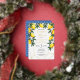 Boho-chic yellow lemons with varying shades of greenery adorning a gemstone geometric frame in gold foil with gold foil "Couple's Shower" script text. Elegant and classy for your engagement occasion. Back features an Italian tile look blue and white background. Composite design by Holiday Hearts Designs.