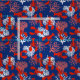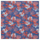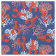 Red, white and blue coastal fabric patterned with red lobsters and pink and white sea coral over navy blue