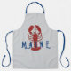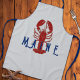 Lobster apron with "Maine" text. A big red lobster is upright on a silver grey background with dark blue lettering. This long apron is perfect for guys who love to cook. The design also transfers fine to the shorter apron, and the kid's size. The text can be removed easily, or change it to something that fits the space. An example would be "Dad" or a shorter name.