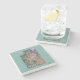 The coasters are gorgeous, a quality feel and heavy weight. They look like a precious archeological find. A rustic stone juxtaposed with a modern floral black and white print. I like the way the print goes slightly imperfect on the cut stone edges giving them a kind-of natural beauty.