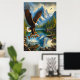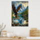 This vivid image captures the moment a majestic bald eagle swoops down effortlessly to snatch a lake trout from the tranquil waters of a mountain lake. The sunrise casts a soft glow on the snow-capped peaks, Pristine environment as the surrounding pines stand tall and undisturbed.