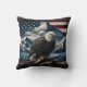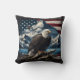 A striking eagle perches on a weathered branch, overlooking snow-capped mountains and a backdrop of the American flag at sunset.