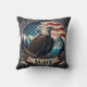 A powerful eagle soars above a serene water body, framed by mountains and trees, embodying strength and freedom against a patriotic backdrop.